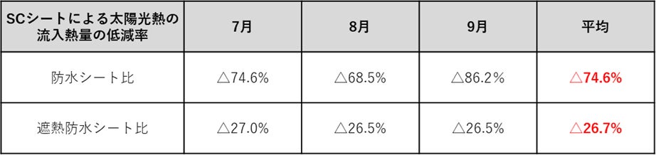 この試算値は、屋根構造の各材料における熱伝導率、熱貫流率、反射率、放射率などを根拠に算出したものである。屋上からの太陽光熱の流入熱量について、SCシート導入により、防水シートとの比較では最大86.2%、平均74.6%の低減となることを試算している。また、遮熱防水シートとの比較では、最大27.0%、平均26.7%の低減となることを試算している。