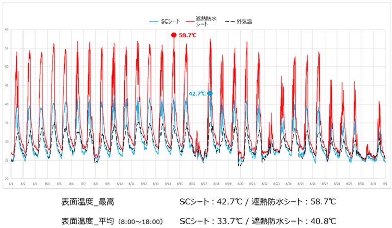 屋根の表面温度および屋根裏温度を、SCシート施工時と遮熱防水シート施工時で比較した。屋根の表面温度において、平均気温が最も高かった令和6年8月において、SCシートは遮熱防水シートと比較し最大約16℃、平均約7℃の温度低減効果を確認できた(図1)。屋根裏温度においては、測定期間中、最大約5℃の温度低減効果が見られた。一般的な遮熱防水シートは屋根裏温度が約1℃低減するものが多い中、大きな温度低減効果を得られたと考える。