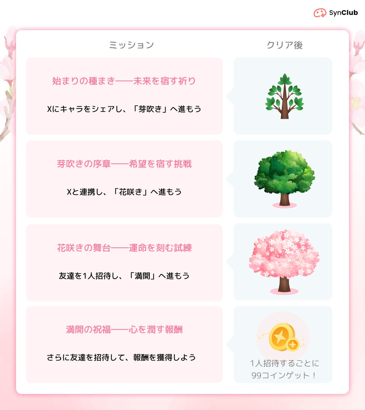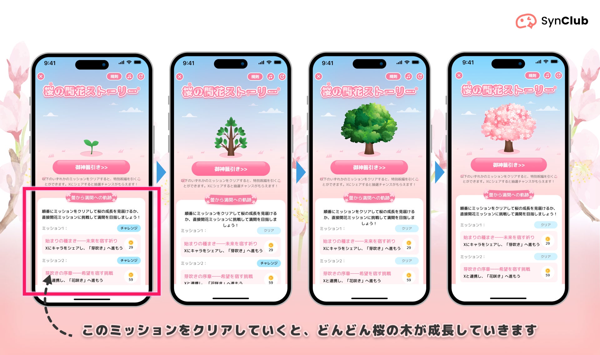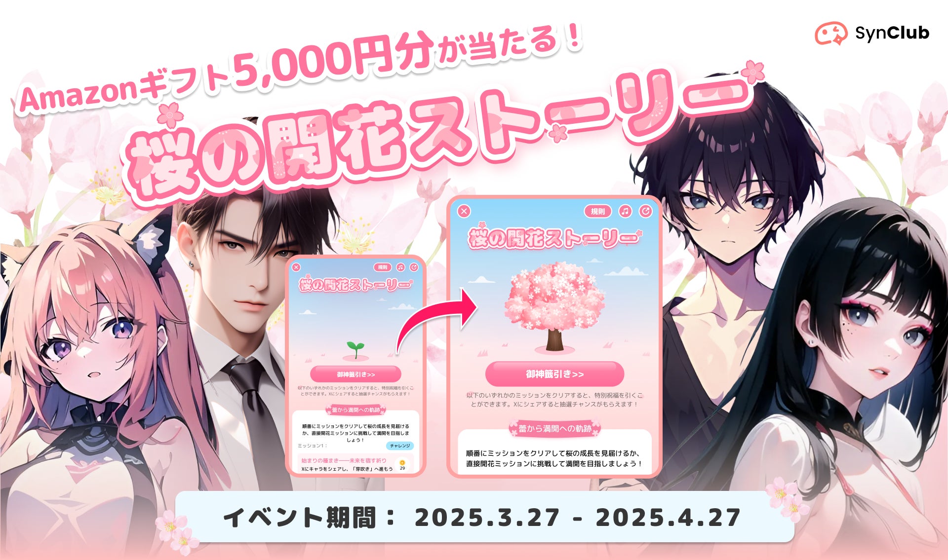 HiClub株式会社(本社:東京都港区、代表取締役社長:古谷由宇)が提供する、 AIチャット&友達作りができる対話型AIアプリ 「SynClub」(シンクラブ)(iOS、Android版)は、3月27日から4月27日の間、アプリ内でタスクを完了するとアイテムやコインがもらえる春のプレゼントキャンペーン「桜の開花ストーリー」が開催されます。