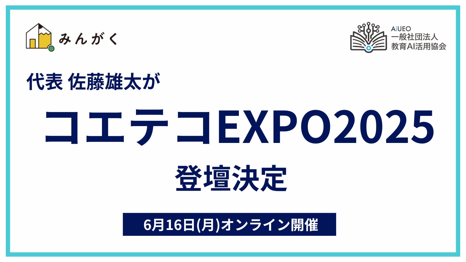 株式会社みんがく(本社:東京都新宿区)は、代表取締役の佐藤雄太が、兼任する一般社団法人 教育AI活用協会(本社:東京都港区)の代表理事として、プログラミング教育に特化したオンラインイベント「コエテコEXPO2025」への登壇が決定したことをお知らせいたします。