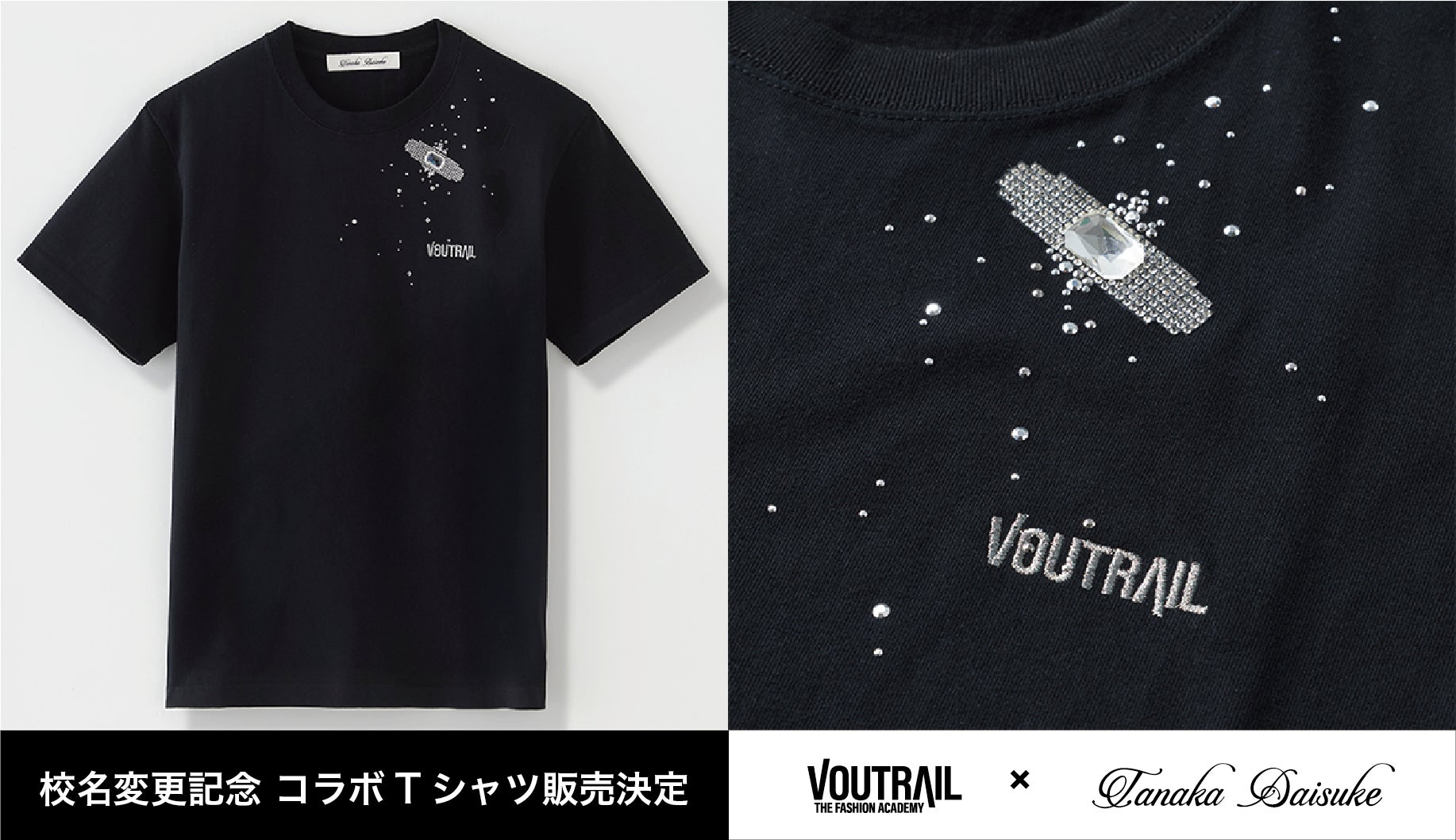 本コラボレーションTシャツは、tanakadaisukeの代名詞ともいえるビジューや刺繍の表現を通して、「VOGUE(ファッション・流行)」と「TRAILBLAZER(開拓者・先駆者)」を掛け合わせた新たな学校名〈VOUTRAIL〉に込めた世界観を可視化した、特別な一着です。