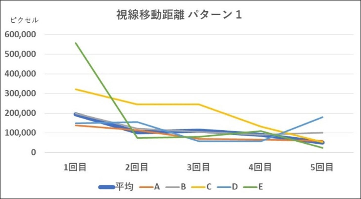 グラフ1:パターン1視線の移動距離(A~Eは協力者を示す)