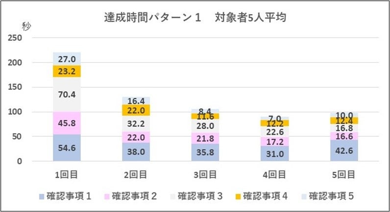 視線計測では、2パターンとも、2~3回目で視線の移動距離が少なくなっていたことから操作する場所がイメージできていると判断でき、メンタルモデルが構築されたと判明しました。所要時間に関しても、視線の移動距離に比例していました(グラフ1・2:パターン1の例)。また、メンタルモデルの構築の促進要因は視線の滞留が短く、阻害要因は視線の滞留が長かったり、注目したり操作すべき部分に視線がすぐにいかなかったりすることが分かりました。