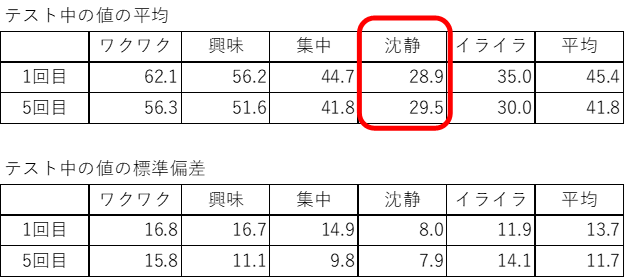 脳波計測では、電通サイエンスジャム製の感性アナライザーで、「ワクワク度」「興味」「集中」「沈静」「ストレス」の5つの感性の平静時からの変化の値を計測。その結果、メンタルモデルの構築されていない1回目は「沈静」以外の平均値が高く、1回目は「ワクワク」「イライラ」しながら利用していたことがわかりました。(表1)