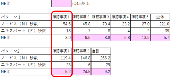 NE比はパターン1全体で5.7、パターン2全体で9.2と比較的高く、初心者にわかりづらく、改善が必要という結果となりました。パターン1・2の確認事項ごとの数値では、確認事項1はそれぞれ他の確認事項よりNE比が低いことが判明しました(表2赤枠)。パターン1・2の確認事項1には、マイページのログインが含まれていましたが、文字の読み間違えが多く、セキュリティを高めるための工夫が、かえってログイン阻害につながる要因となっていました。(図1)。