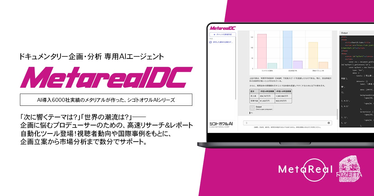 業種特化の専門AI開発・運営を行う株式会社メタリアル(本社:東京都千代田区、代表取締役:五石順一)は、ドキュメンタリー企画・市場分析レポート作成AIエージェント「Metarealドキュメンタリー」(以下、Metareal DC)を6月19日(木)に新開発・提供開始したことを発表します。