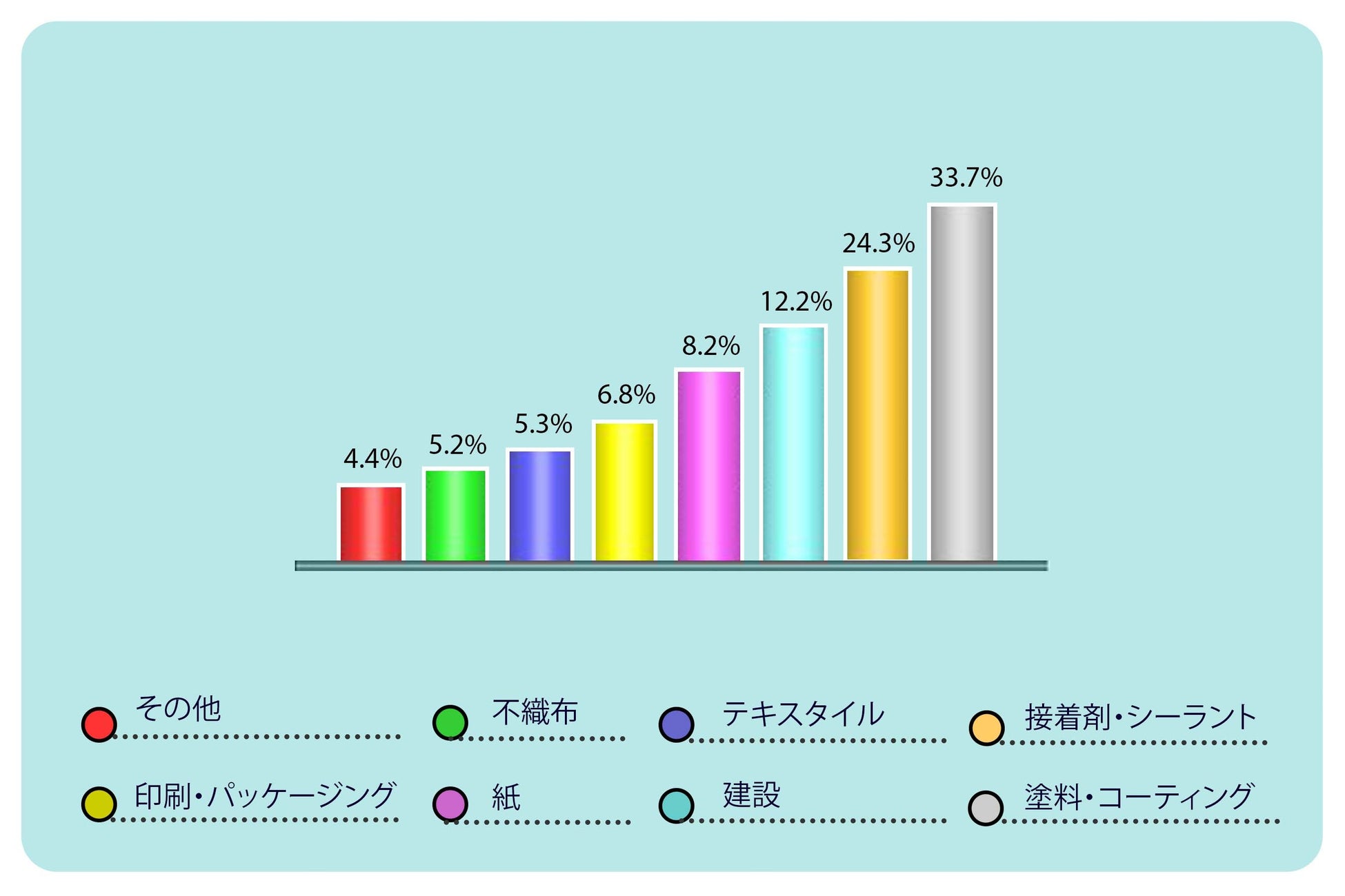 塗料およびコーティング部門は、2021 年に 33.7% で最高のシェアを占めました。