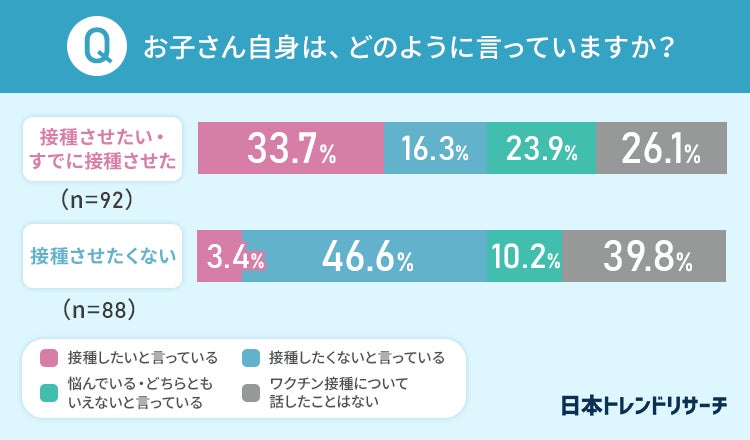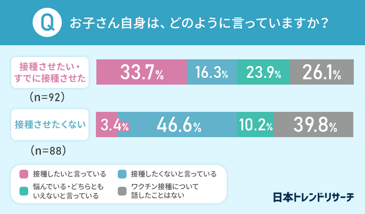一方で、「接種させたくない」という方は、46.6%と約半数の方がお子さんも「接種したくないと言っている」ようです。