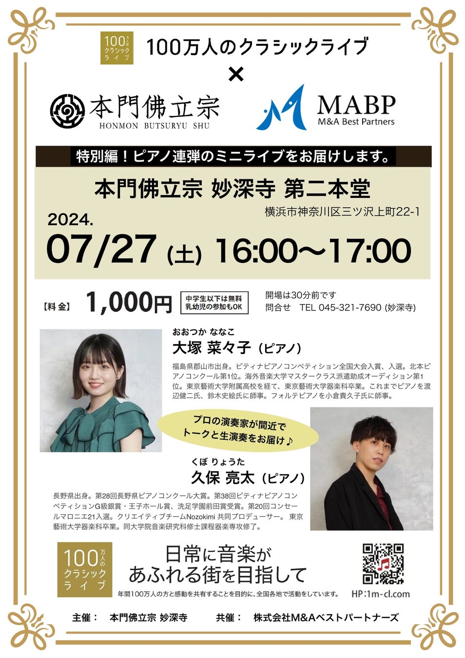 【M&Aベストパートナーズ×100万人のクラシックライブ】7月27日(土)に本門佛立宗 妙深寺にて、クラシックライブを開催!