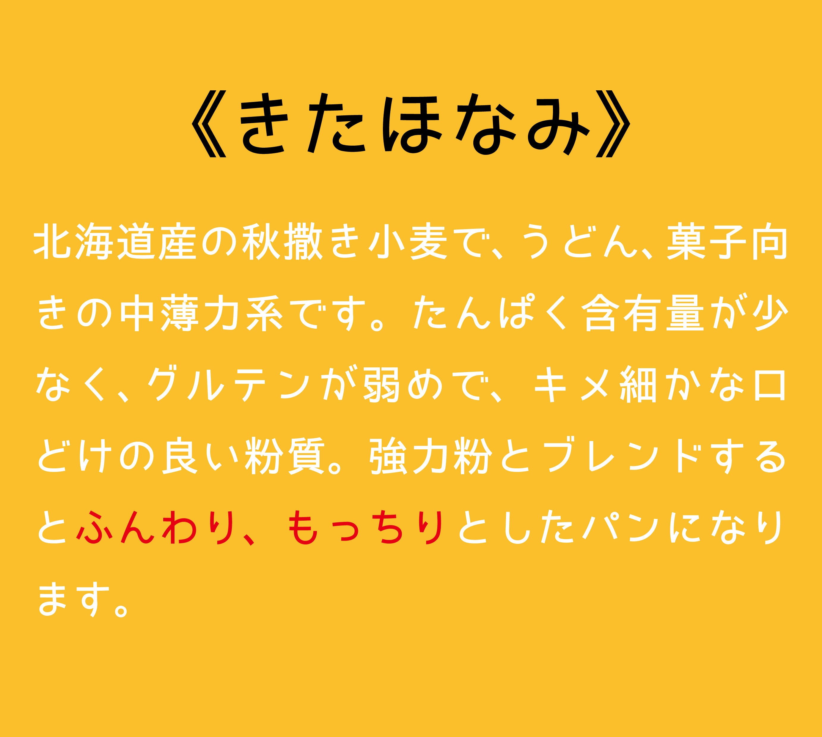 もっちりした食感の「ゆめちから」× 小麦の風味豊かな「きたほなみ」が ベストなバランスでブレンドされた小麦粉を使用しています。