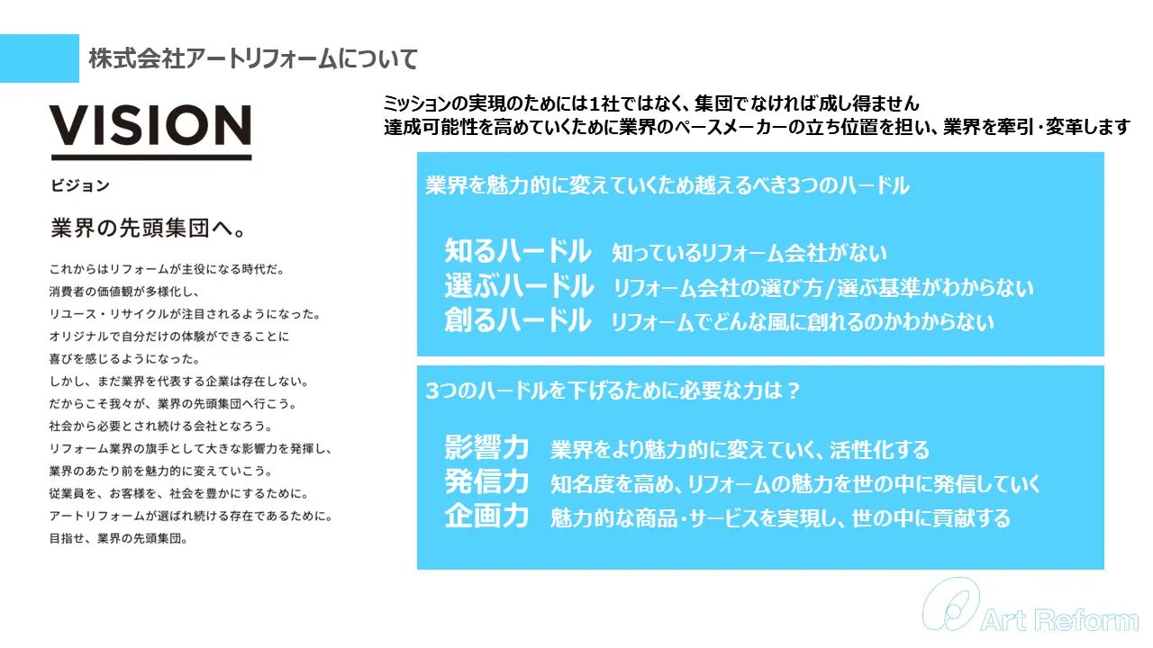 創業70年、年間6500件以上のリフォームを施工し、関東、関西、東海、九州に展開するアートリフォーム。大手不動産仲介会社各社のパートナーとなり、中古物件購入時のリフォームを手掛けるBtoB事業、WEBや折込チラシからの反響顧客に対するリフォーム提案のBtoC事業を展開。利用者数No.1のリフォーム会社サイト「ホームプロ」においては13年連続でリフォーム完了件数西日本第一位、2022年度は完了金額西日本第一位の表彰を受けている。また、2022年度の売上ランキングでは西日本の総合リフォーム店で1位となり、ビジョンである『業界の先頭集団』に向けて成長を続けている。