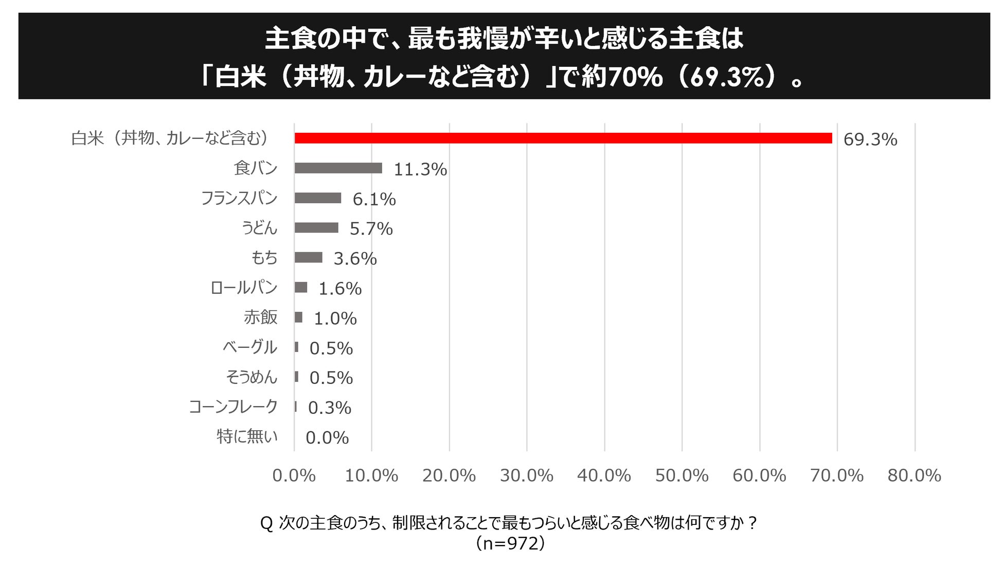 主食の中で、最も我慢が辛いと感じる主食は「白米(丼物、カレーなど含む)」で約70%(69.3%)。
