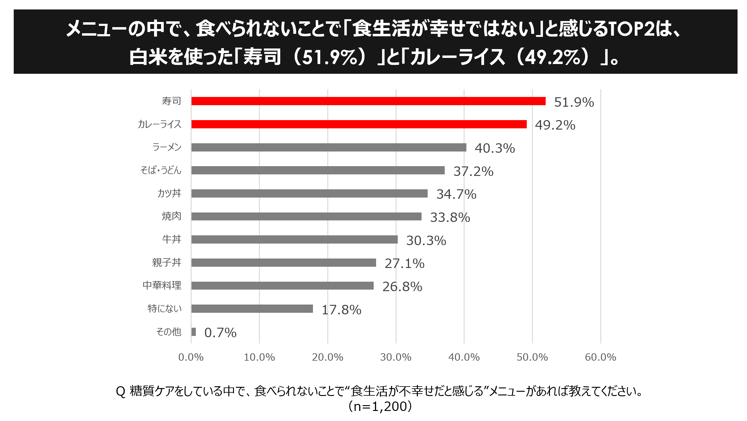 メニューの中で、食べられないことで「食生活が幸せではない」と感じるTOP2は、白米を使った「寿司(51.9%)」と「カレーライス(49.2%)」。
