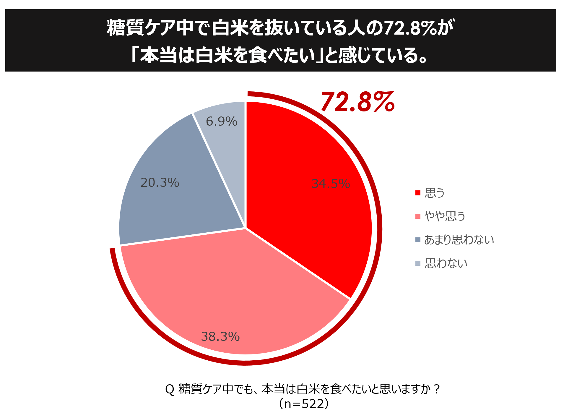 ・糖質ケア中で白米を抜いている人の72.8%が「本当は白米を食べたい」と感じている。