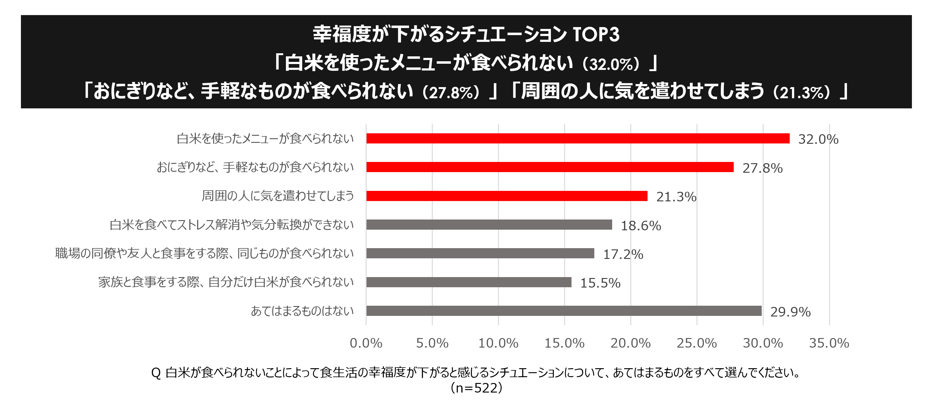 幸福度が下がるシチュエーションTOP3は「白米を使ったメニューが食べられない(32.0%)」、
