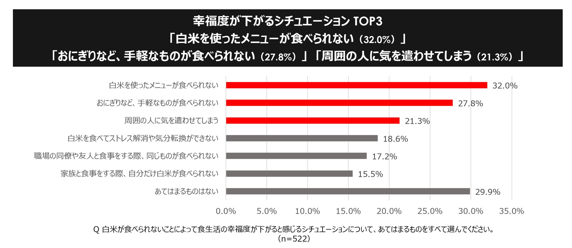 ・幸福度が下がるシチュエーションTOP3は「白米を使ったメニューが食べられない(32.0%)」、