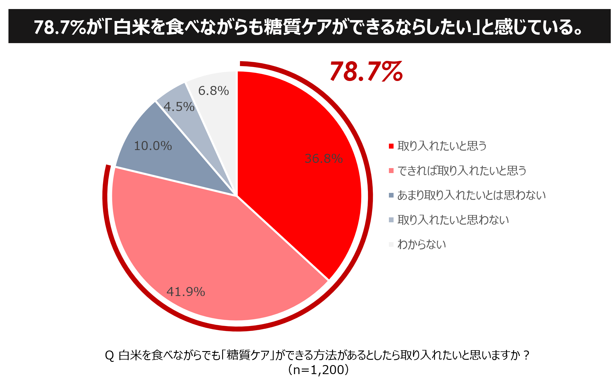 ・78.7%が「白米を食べながらも糖質ケアができるならしたい」と感じている。
