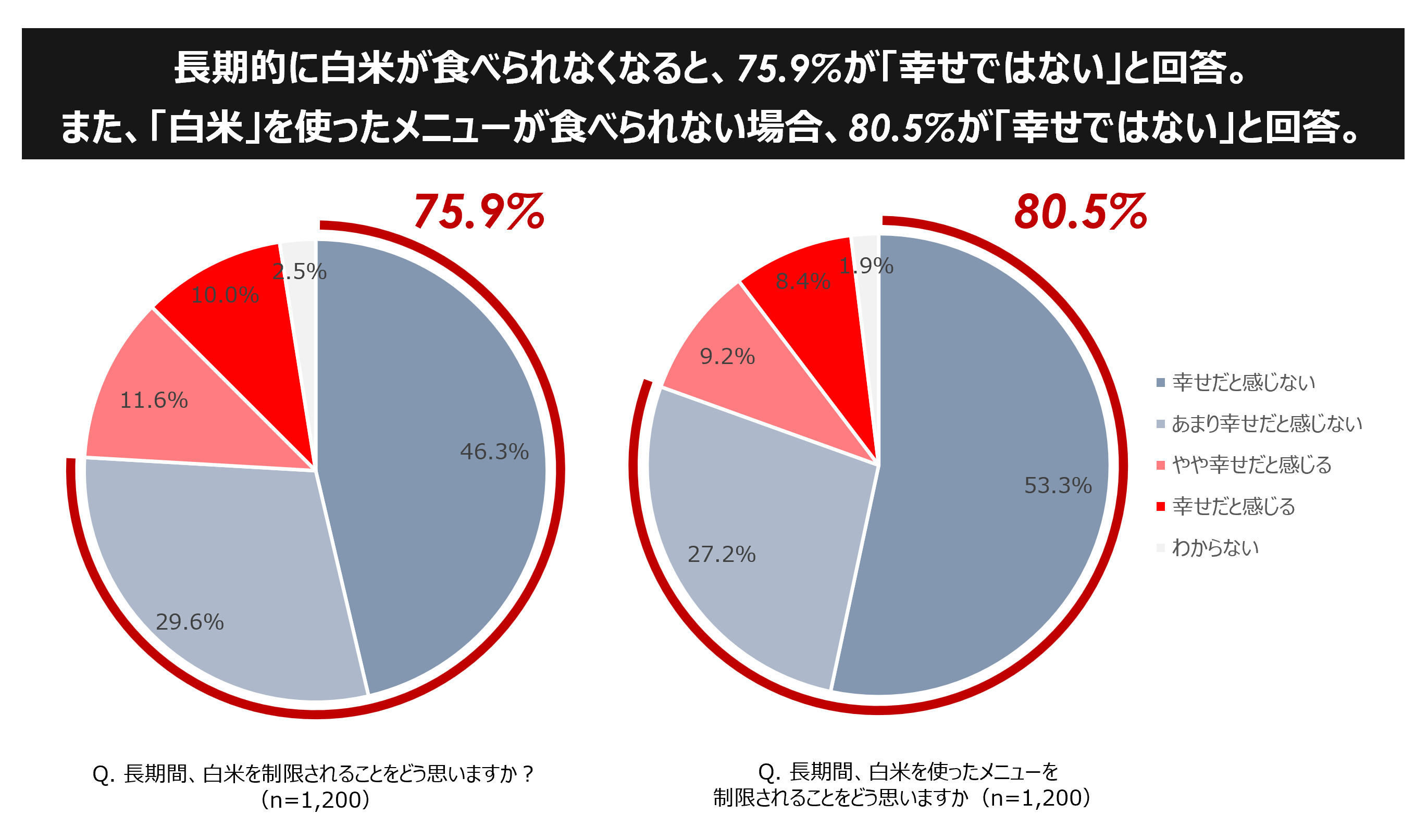長期的に白米が食べられなくなると75.9%が「幸せではない」と回答。また、「白米」を使ったメニューが食べられない場合、80.5%が「幸せではない」と回答。