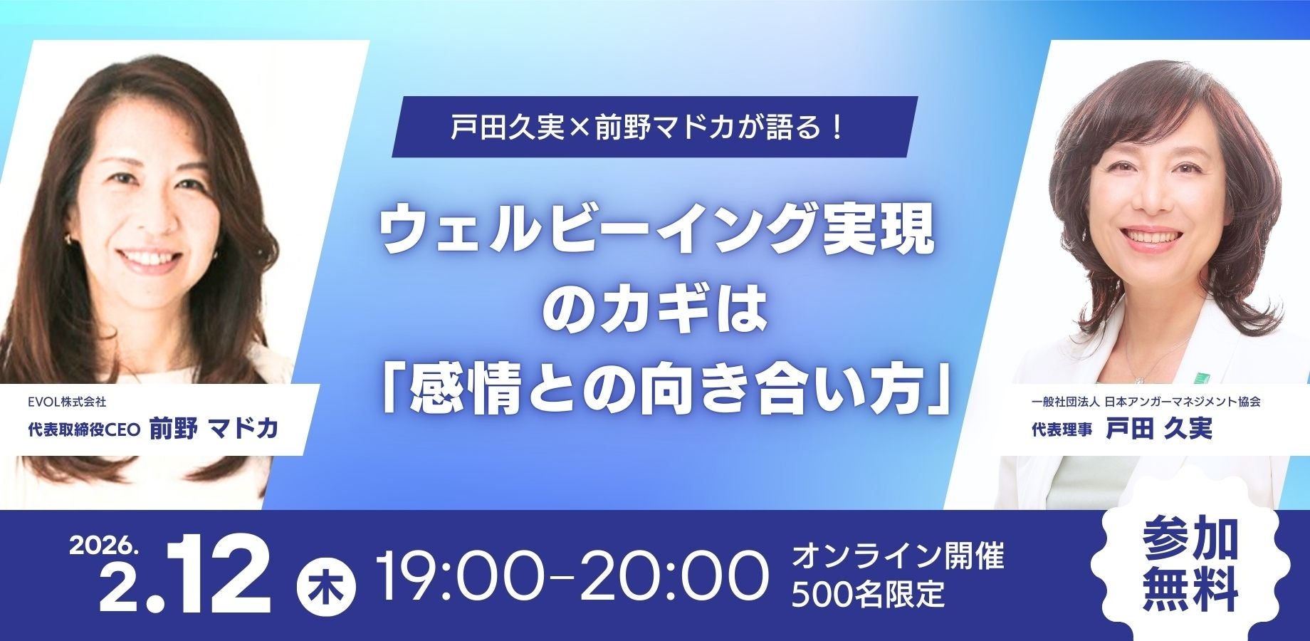 株式会社レビックグローバル(本社:東京都港区、代表取締役社長:柏木 理)が運営する一般社団法人日本アンガーマネジメント協会(所在地:東京都港区、代表理事:戸田 久実)は、EVOL株式会社 代表取締役CEO・前野マドカ氏をゲストに迎え、特別対談イベント「ウェルビーイングを実現する自身の感情との向き合い方」を2026年2月12日(木)19:00よりオンラインにて開催します。