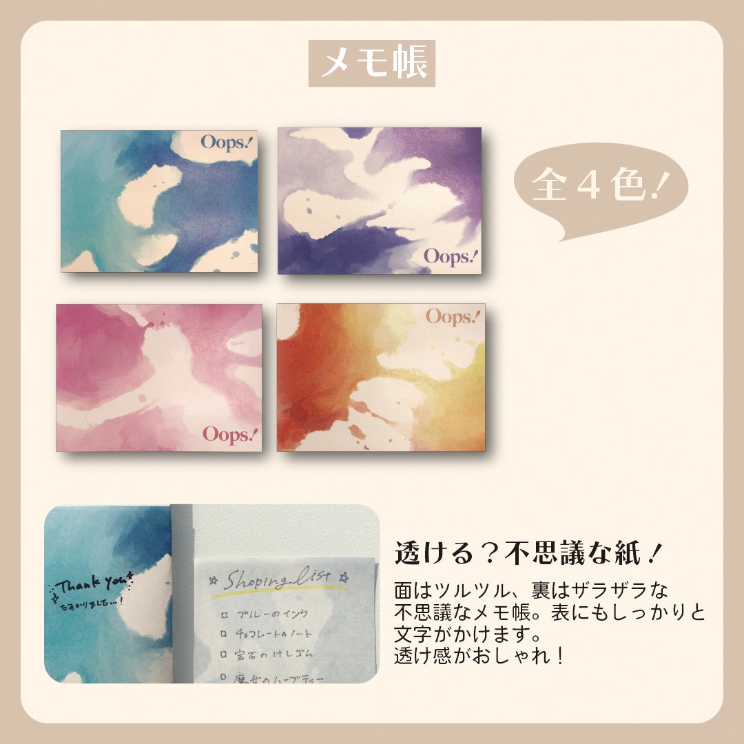 (左)メモパッド BL / PK / OR / PL (全4色) Oops! 各550円(税込)