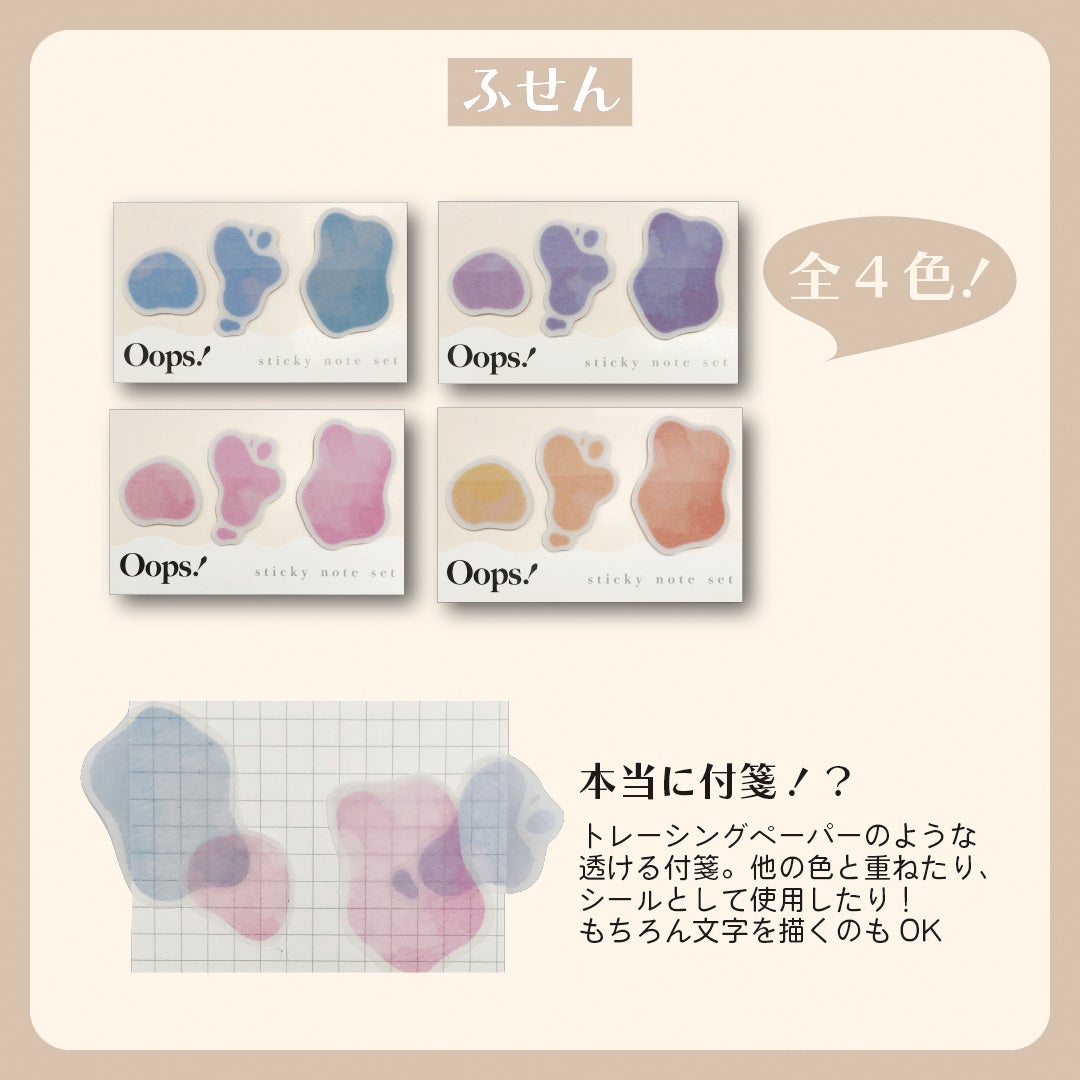 (左)クリア付箋 BL / PK / OR / PL (全4色) Oops! 各715円(税込)