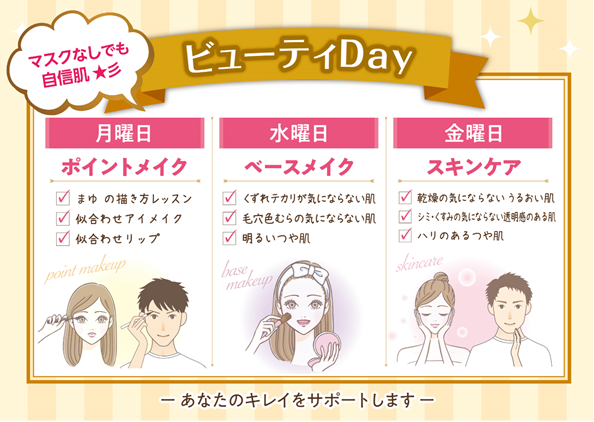 マスクなし生活に備えるメイク・スキンケアのアドバイスを行う「ビューティDAY」では、曜日ごとにポイントメイクの日、ベースメイクの日、スキンケアの日を設定し、マスクなし生活に向けてそれぞれのお客様に最適なメイク・スキンケアのご提案を行います。また、タッチアップが苦手なお客様にはアプリを活用したカウンセリングアドバイスを行うなど、感染症対策への配慮やあらゆるニーズにお応えします。