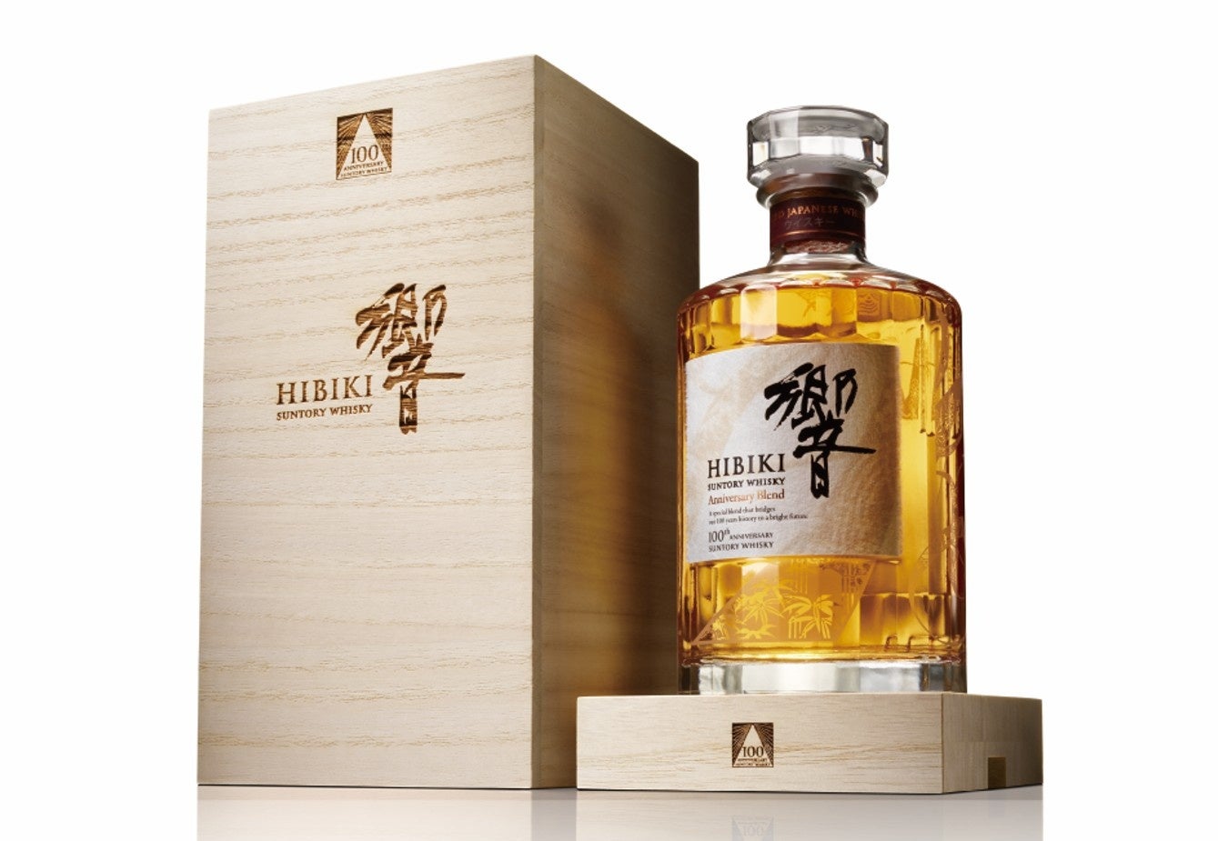 酒齢17年以上の個性豊かな原酒に、30年を超える山崎ミズナラ樽モルト、円熟の知多グレーンを丁寧に重ねた「響」100周年ブレンド。
