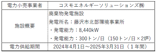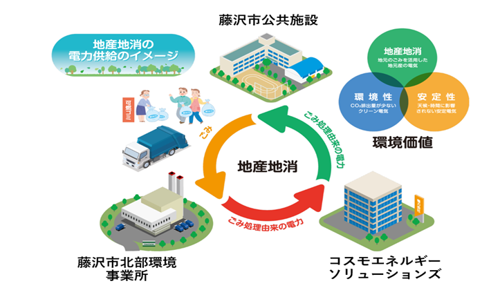 本契約では、藤沢市北部環境事業所(発電出力8,440kW)で廃棄物(ゴミ)処理により発電した余剰電力をコスモエネルギーソリューションズが買い取り、藤沢市の公共施設に供給を行います。市内の家庭や事業所、公共施設等から回収された廃棄物を、CO2排出量ゼロの電気(※1)に生まれ変わらせることができます。また、地元で有効活用される電力の地産地消を推進する取り組みです。