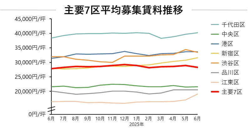 主要7区の平均募集賃料は28,275円/坪 前月比:-586円/坪