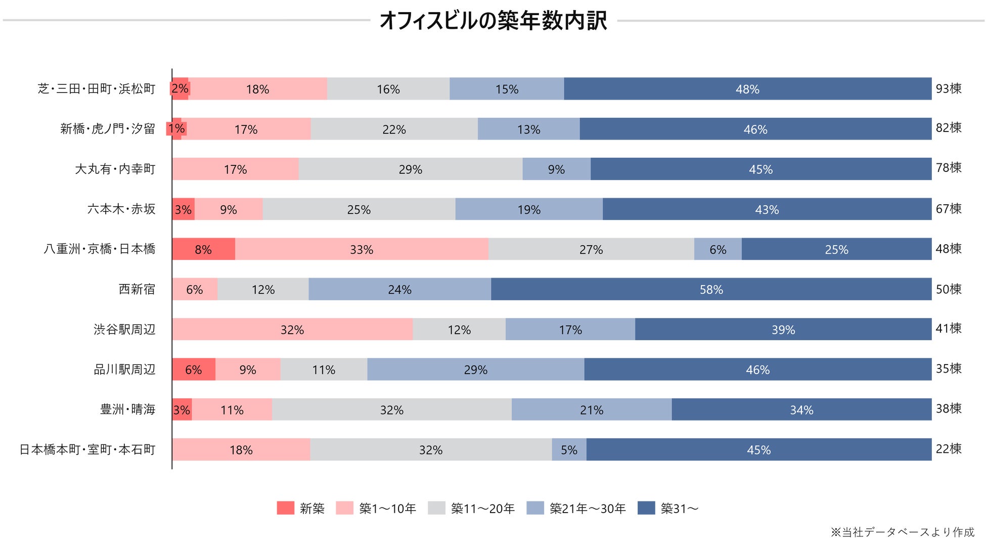 【その他トピックー主要エリアにおけるオフィスビルの築年数内訳】