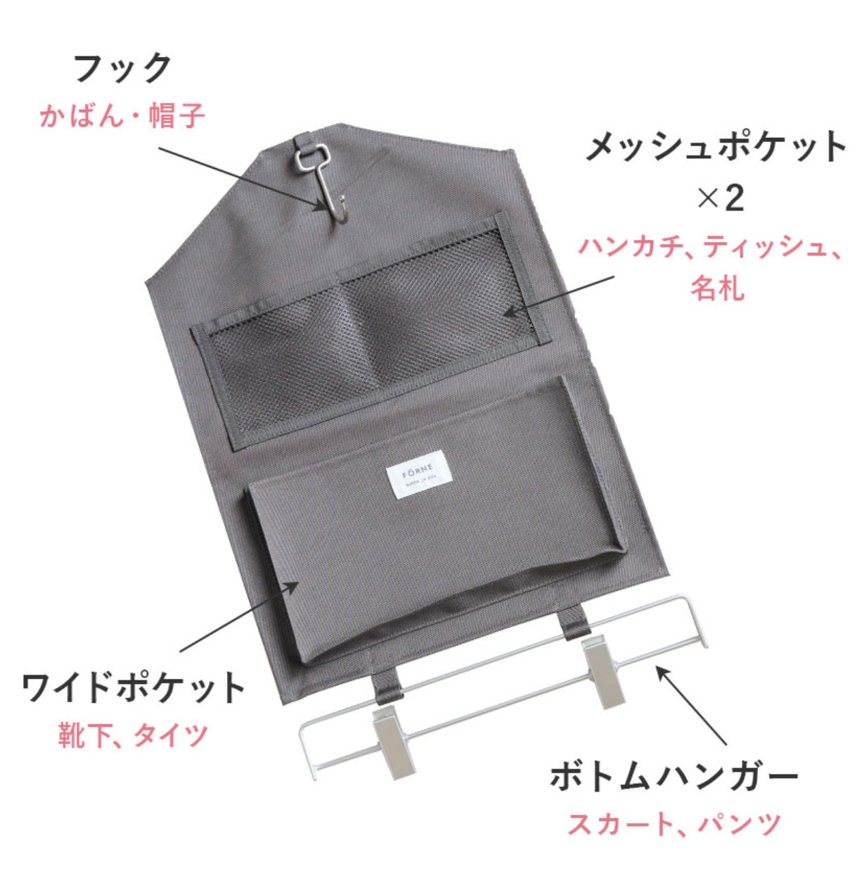 トップスを掛けられるハンガーに、フック、ポケット、ボトムハンガーが一体化したような、機能的な収納アイテムです。