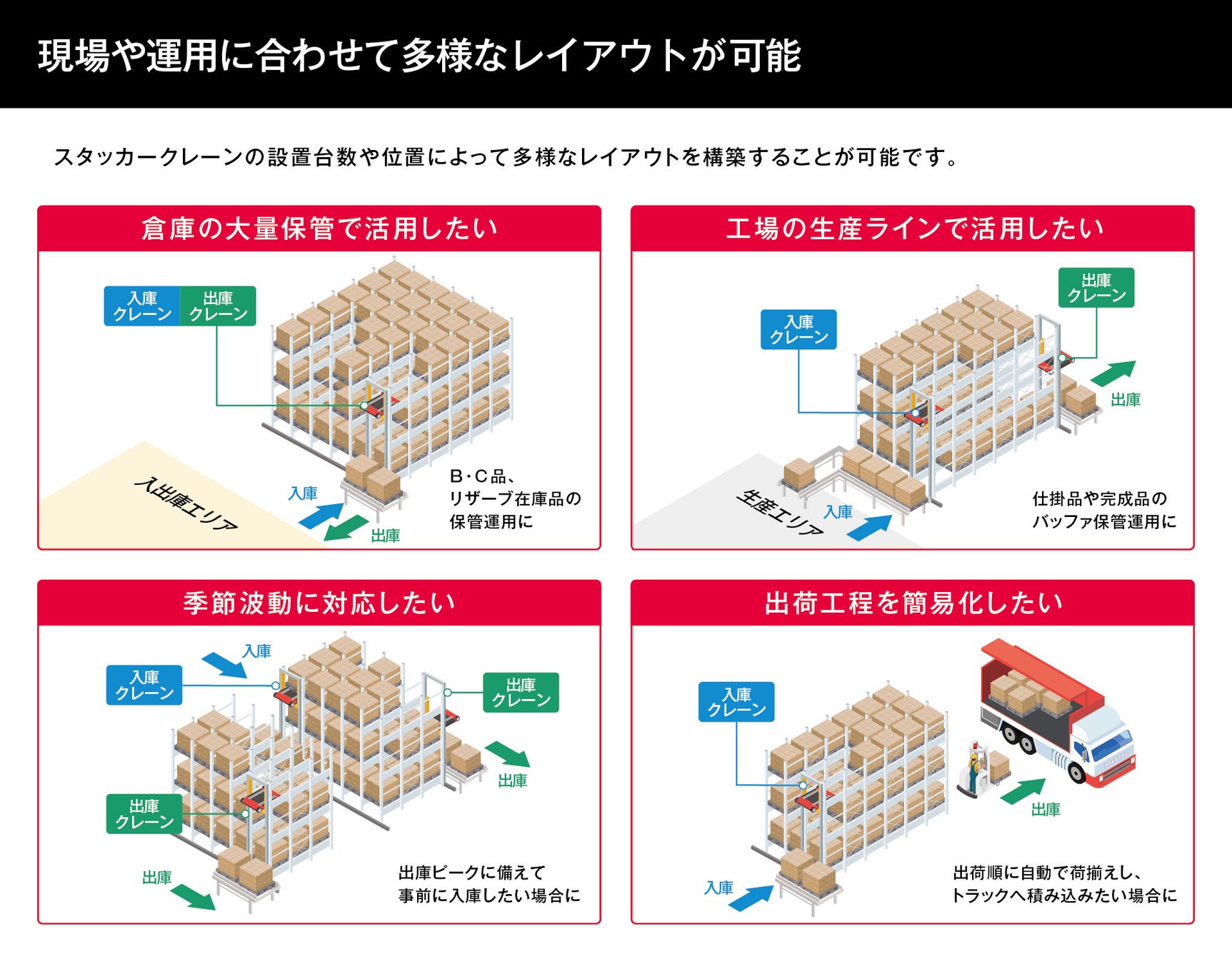 入出庫に使用するクレーンの位置や台数を現場の要件や運用、レイアウトに合わせて設定することが可能です。入庫にスタッカークレーンを使用し、出庫はフォークリフトで行うレイアウトにするなどの対応が可能です。