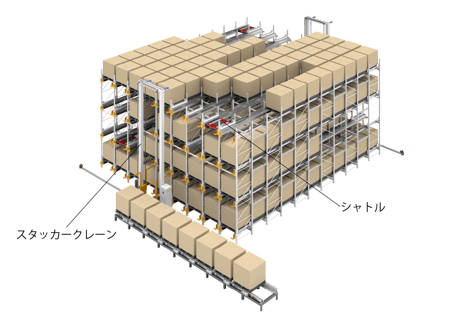 保管・入出庫作業をシャトルとスタッカークレーンの組み合わせで自動化します。上位システムから、決められたロケーションへの入庫指示や計画に基づいた出庫指示が可能です。また、コンベヤやAMR・AGVと連動することで、前後の搬送工程も自動化することができます。入出庫作業の完全自動化により、早朝・夜間作業や24時間稼働に対応が可能です。