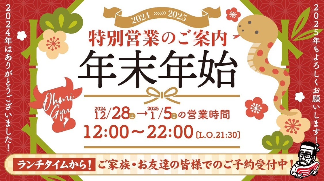 株式会社総合近江牛商社(本社:滋賀県守山市/代表取締役社長:西野 立寛)が運営する【近江焼肉ホルモンすだく】は、年末年始の2024年12月28日~2025年1月5日の期間中、直営店舗では12時~22時まで営業いたします。