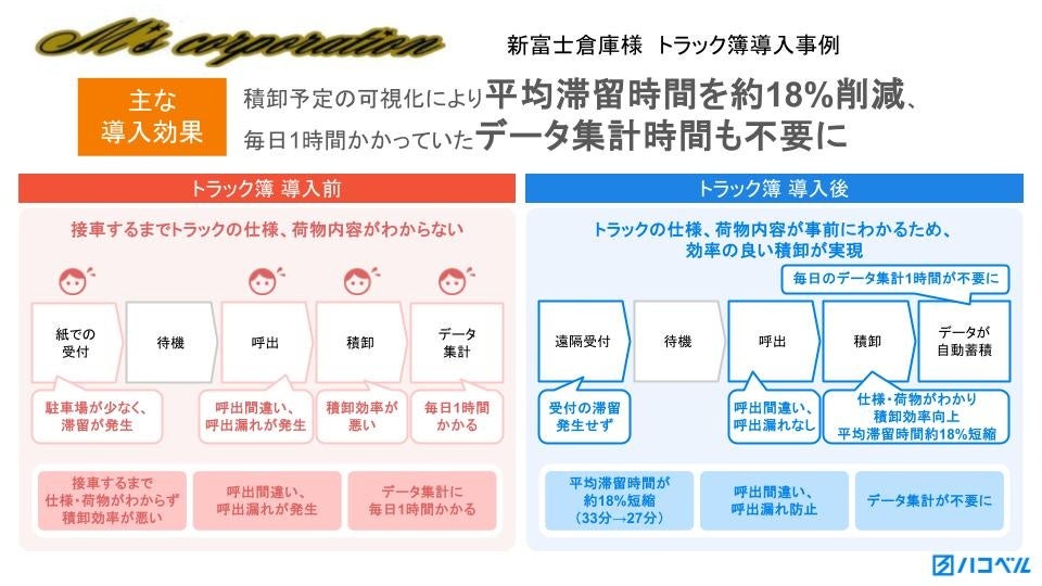 ハコベル株式会社(本社:東京都中央区、代表取締役社長CEO:狭間 健志、以下:ハコベル)は、株式会社 エムズコーポレーション(本社:栃木県宇都宮市、代表者:清水 実、以下:エムズコーポレーション)の新富士倉庫における「トラック簿」の導入事例記事を公開しました。
