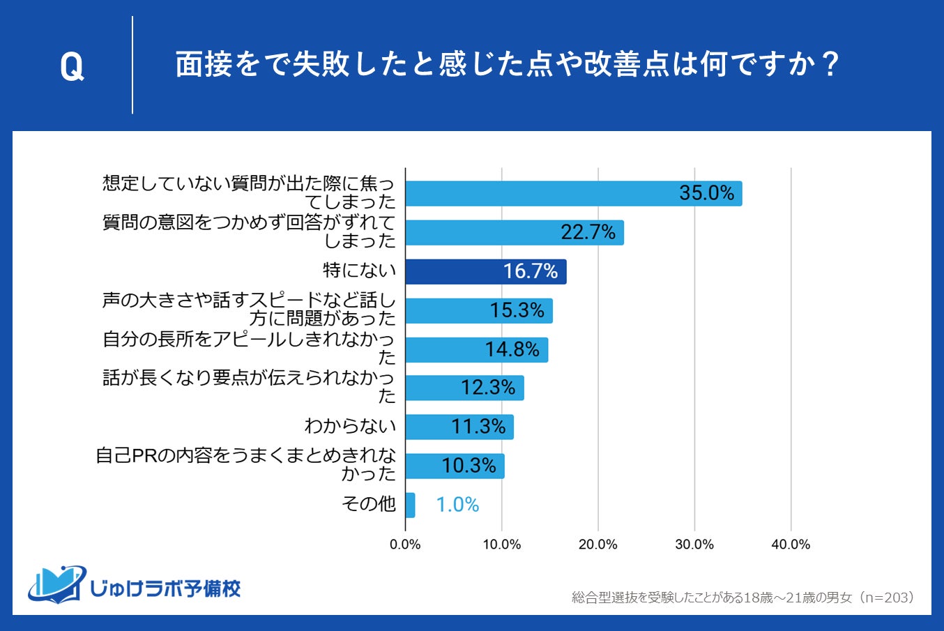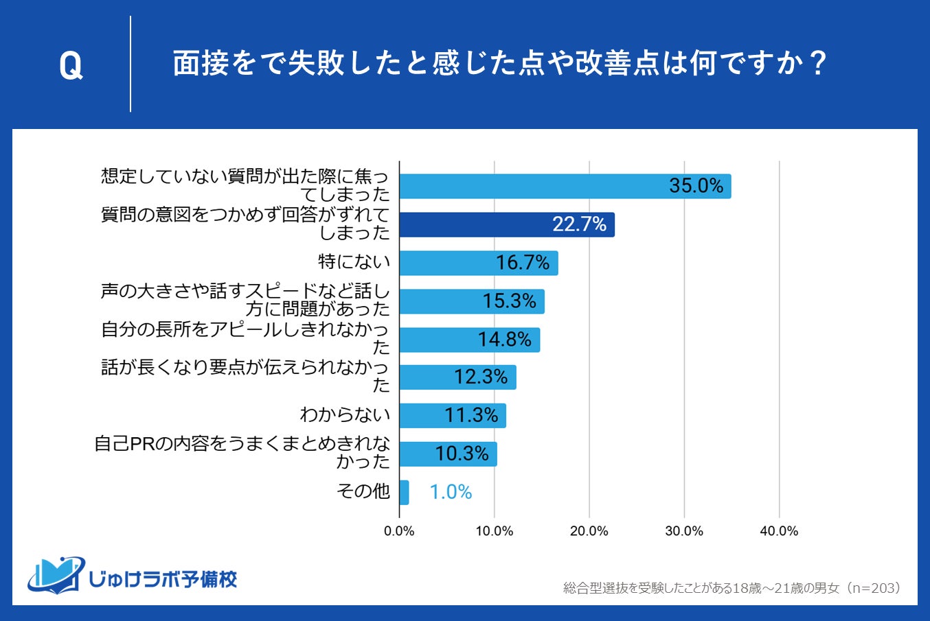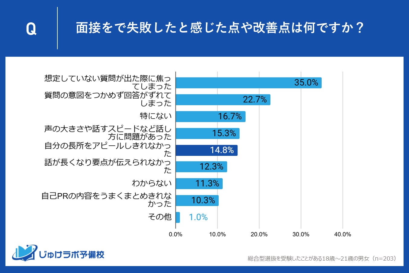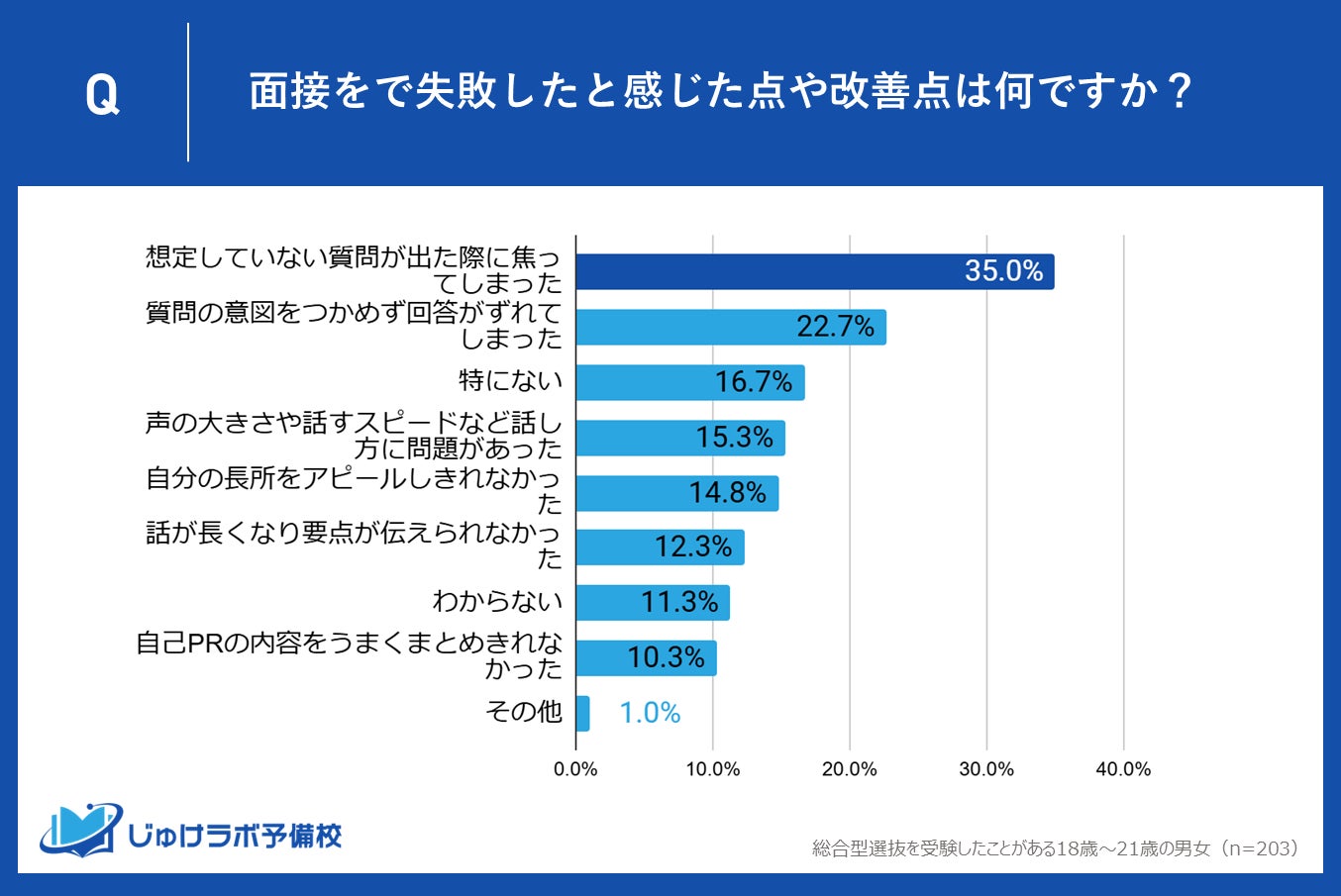 調査結果によると、35.0%の受験生が「想定していない質問が出た際に焦ってしまった」と回答。急な質問に対して冷静さを欠き、準備していなかったためにうまく回答できなかったケースが目立ちます。