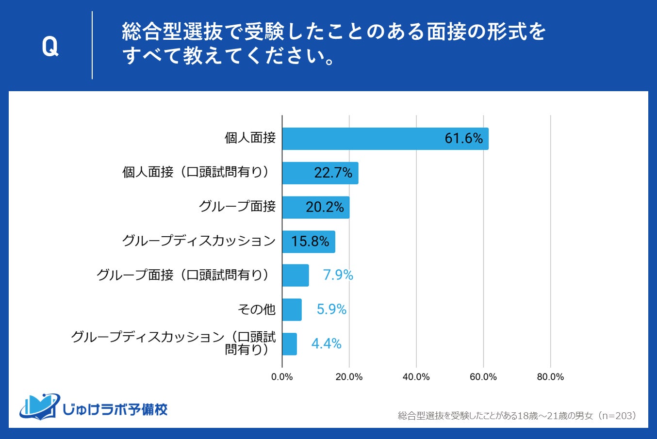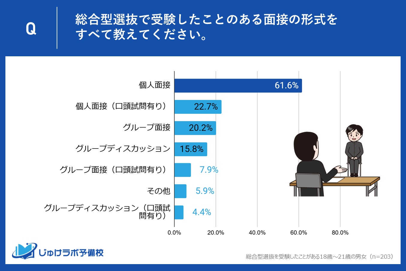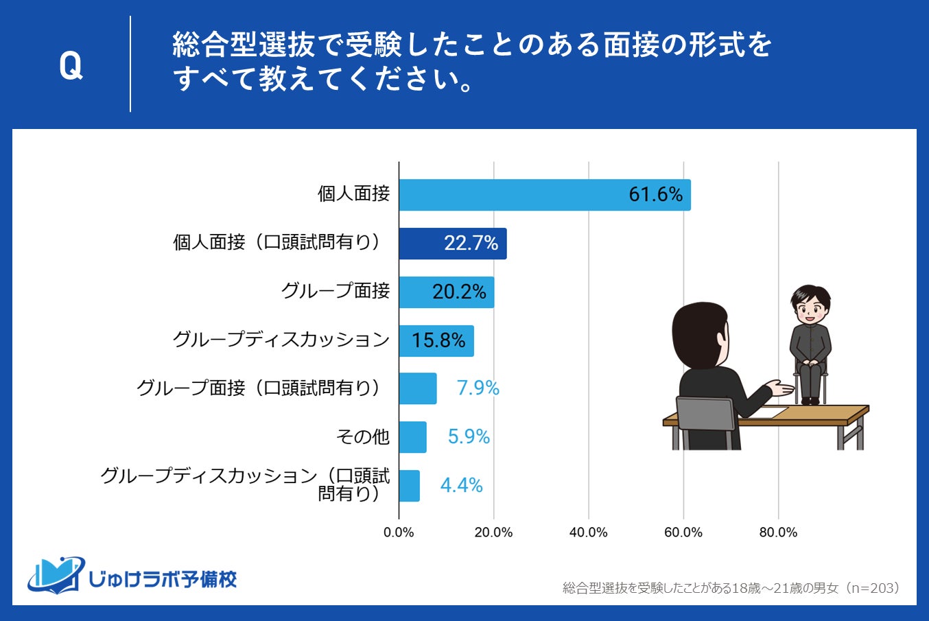じゅけラボ予備校(所在地:大阪市北区、代表取締役:後藤智則)は、総合型選抜入試で大学受験をした18歳〜21歳の男女203人を対象に、総合型選抜入試で受験した面接試験に関する実態調査を実施しました。