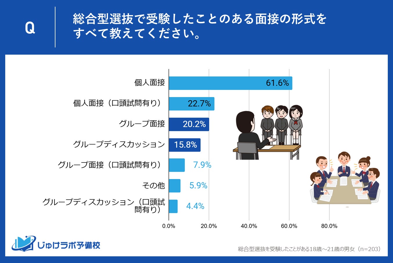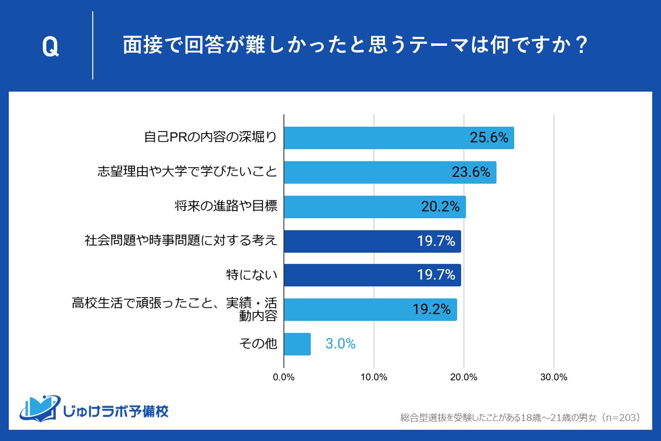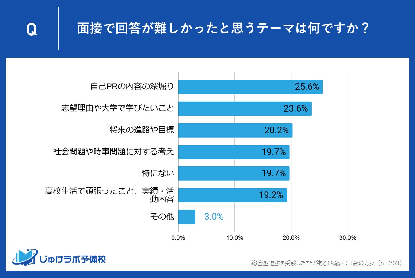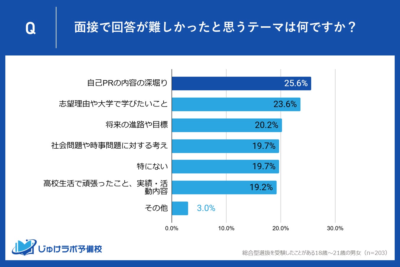 じゅけラボ予備校(所在地:大阪市北区、代表取締役:後藤智則)は、総合型選抜入試で大学受験をした18歳〜21歳の男女203人を対象に、総合型選抜入試で受験した面接試験に関する実態調査を実施しました。