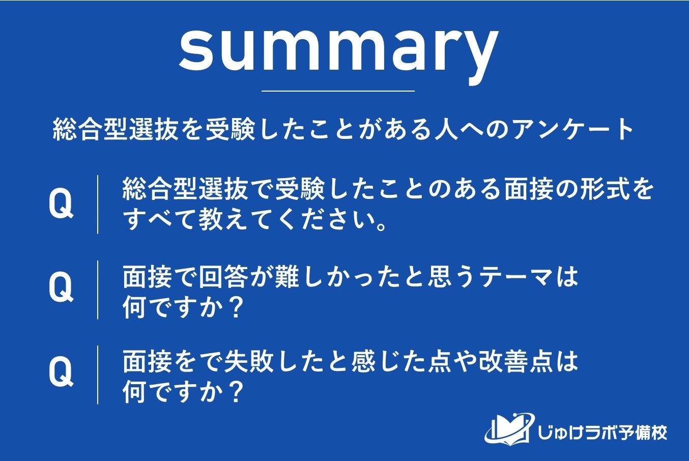 全体として、本調査は各面接形式の現状と、受験生が直面する面接試験における具体的な課題を網羅し、これから総合型選抜入試に向けて面接対策の準備を進めていく受験生にとって役立つ情報の提供になりました。