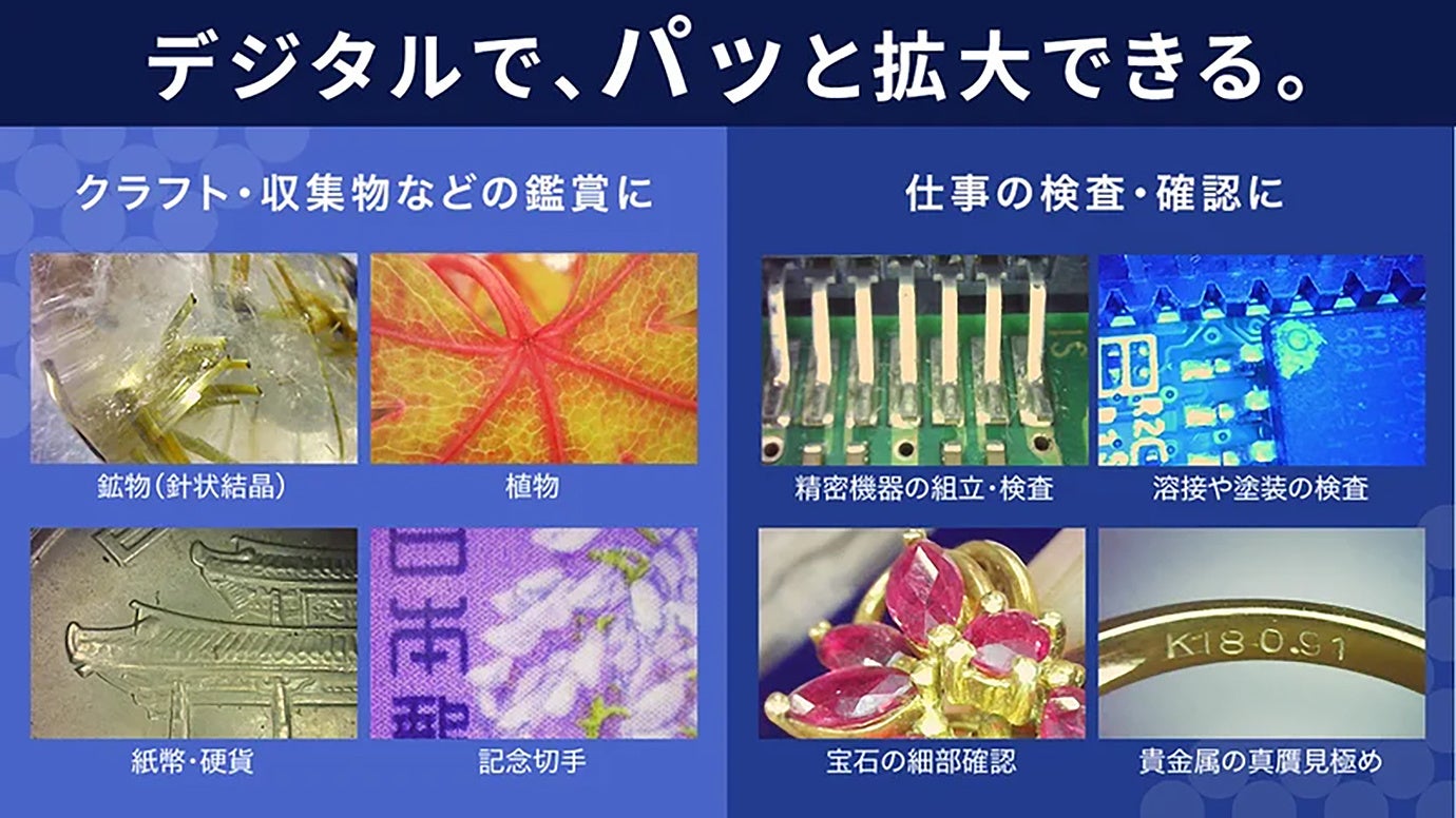 最大15倍までの拡大観察に対応し、LEDライトを搭載しているため暗い場所でも鮮明に観察可能。観察した映像はその場で撮影・保存でき、検査やメンテナンス、趣味の観察など多彩なシーンで活躍します。