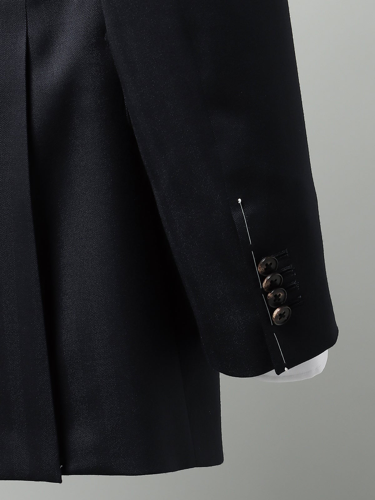 ウエストのシェイプ、袖付け、襟付けを重要視し、シルエットと着用感の双方にこだわりました。ウエスト位置は、高く設定し美しいシルエットに。袖付けは、袖山が自然に盛り上がる英国らしさを演出し、さらに袖に膨らみを持たせることで着用感も向上させました。襟付けは、上襟をのぼらせることで襟が吸い付くように綺麗に収まる美しいシルエットにしています。また細かい仕様では、着丈を長くしベントを深く設定した他、フラワーホールは英国仕様の25mmで設定しました。