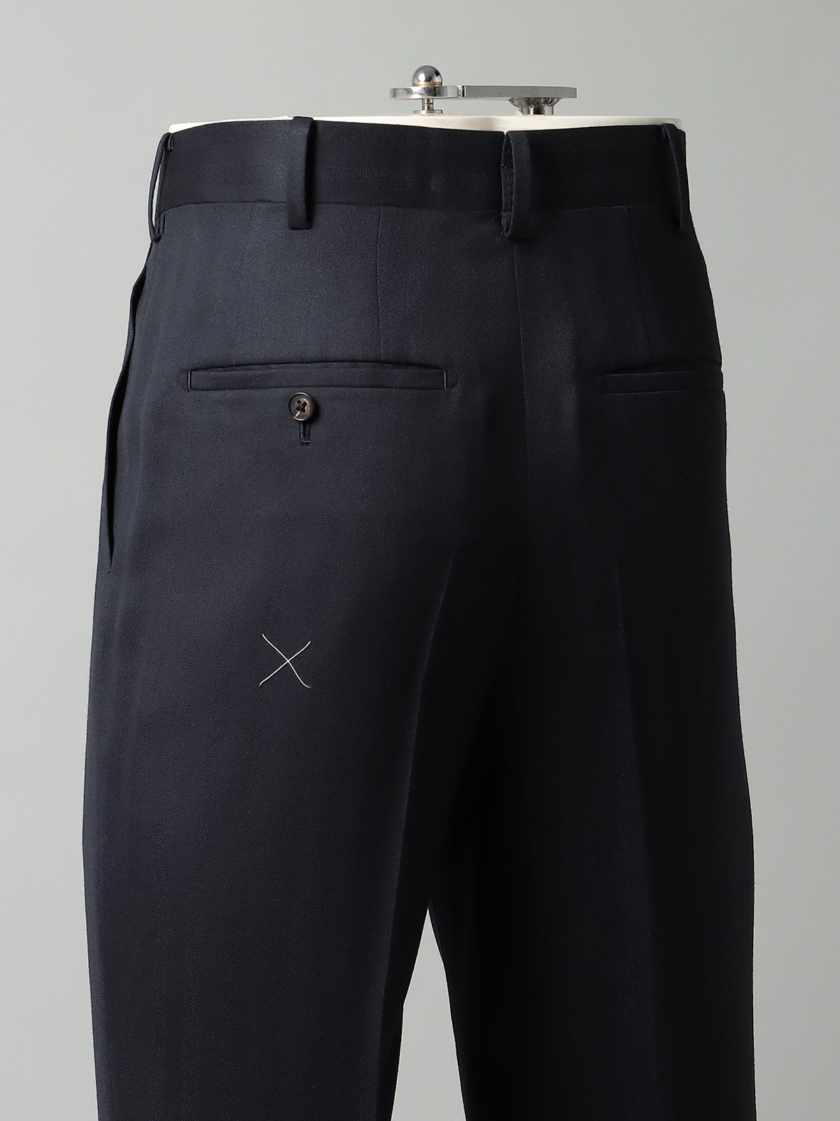 綺麗なシルエットとFUMIYA HIRANOらしさを表現しました。シルエットは、股上深めの1インタックでクリースラインを綺麗に見せる他、ウエストサイズによってフロント外側でボタンを留めることができる帯の長さを調整しバランスを取りました。さらに、ウエスト後ろのVカット部分にしゃがんだ際の型崩れと着用感の悪化を防ぐ効果のあるループを取り付けています。