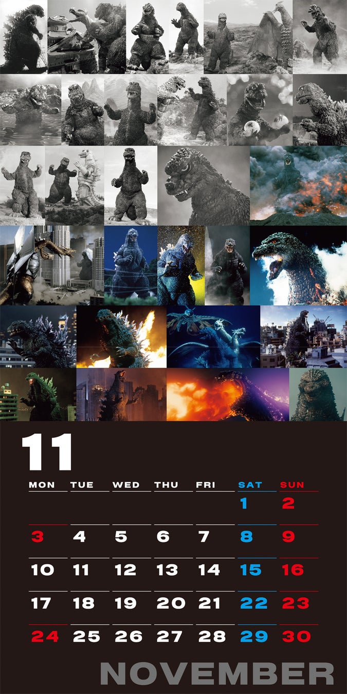 ゴジラ誕生月の11月ページには、最新作『ゴジラ-1.0』を含めた国内実写ゴジラ映画30作品の歴代ゴジラ達が大集合!