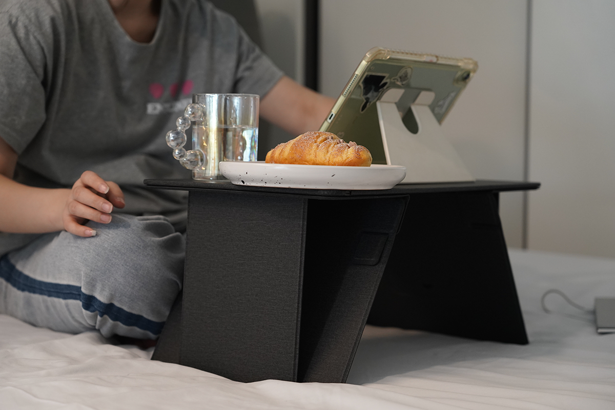 広げるとベッド用のテーブルとして活用でき、リラックスしながら映画鑑賞や読書が可能です。ふかふかのベッドの上で、快適な作業環境をすぐに整えることができます。