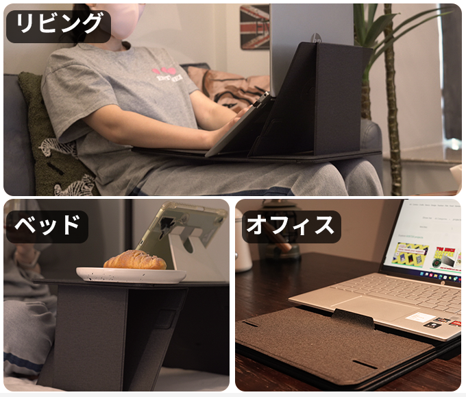 例えば、ソファでの映画鑑賞やベッドでの読書の際には、理想的なリラックススペースを提供し、デスクのように安定してノートPC作業のサポートもしてくれます。