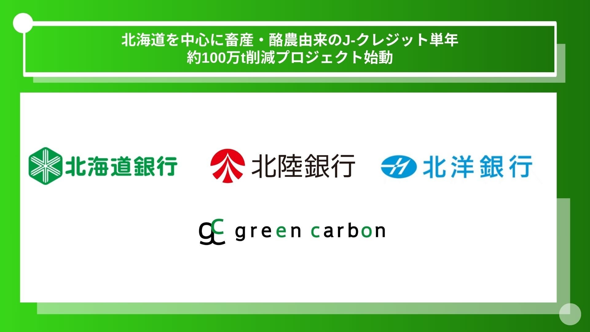 ネイチャーベースのカーボンクレジット創出販売事業を展開するGreen Carbon株式会社(代表取締役:大北潤、以下:Green Carbon(読み;グリーンカーボン))は、ほくほくフィナンシャルグループの株式会社北海道銀行(頭取:兼間 祐二、以下:北海道銀行)および株式会社北陸銀行(頭取:中澤 宏、以下:北陸銀行)、株式会社北洋銀行(頭取:津山 博恒、以下:北洋銀行)、北海道に拠点を置く酪農メガファーマ、各機器メーカーと連携し、日本初となる酪農由来のJ-クレジット創出に向けた、日本初のプログラム型の登録が完了したことをお知らせします。