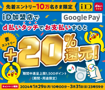 先着エントリー10万名さま限定で、 Google Pay にd払いタッチを追加し、全国の「iD」加盟店でお買物いただくと、期間中のお買物合計金額の20%のdポイント(期間・用途限定)を進呈いたします。詳細は別紙2をご確認ください。