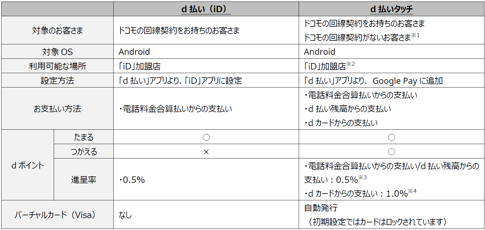 今回提供開始するd払いタッチは、「d払い」アプリから Google Pay に追加いただくことで、ドコモの回線のご利用有無に かかわらず幅広いお客さまに(※3)、スマートフォンをかざしてお支払いいただける機能です。これによりカンタンに「iD」決済をご利用いただけます。お支払い方法は、電話料金合算払いからの支払いに加え、dカードやd払い残高からの支払いが追加となります。「d払い」のコード決済と同様にdポイントがためられるだけでなく、お支払い時にdポイントをご利用いただけるようになります。機能の詳細は別紙1をご確認ください。