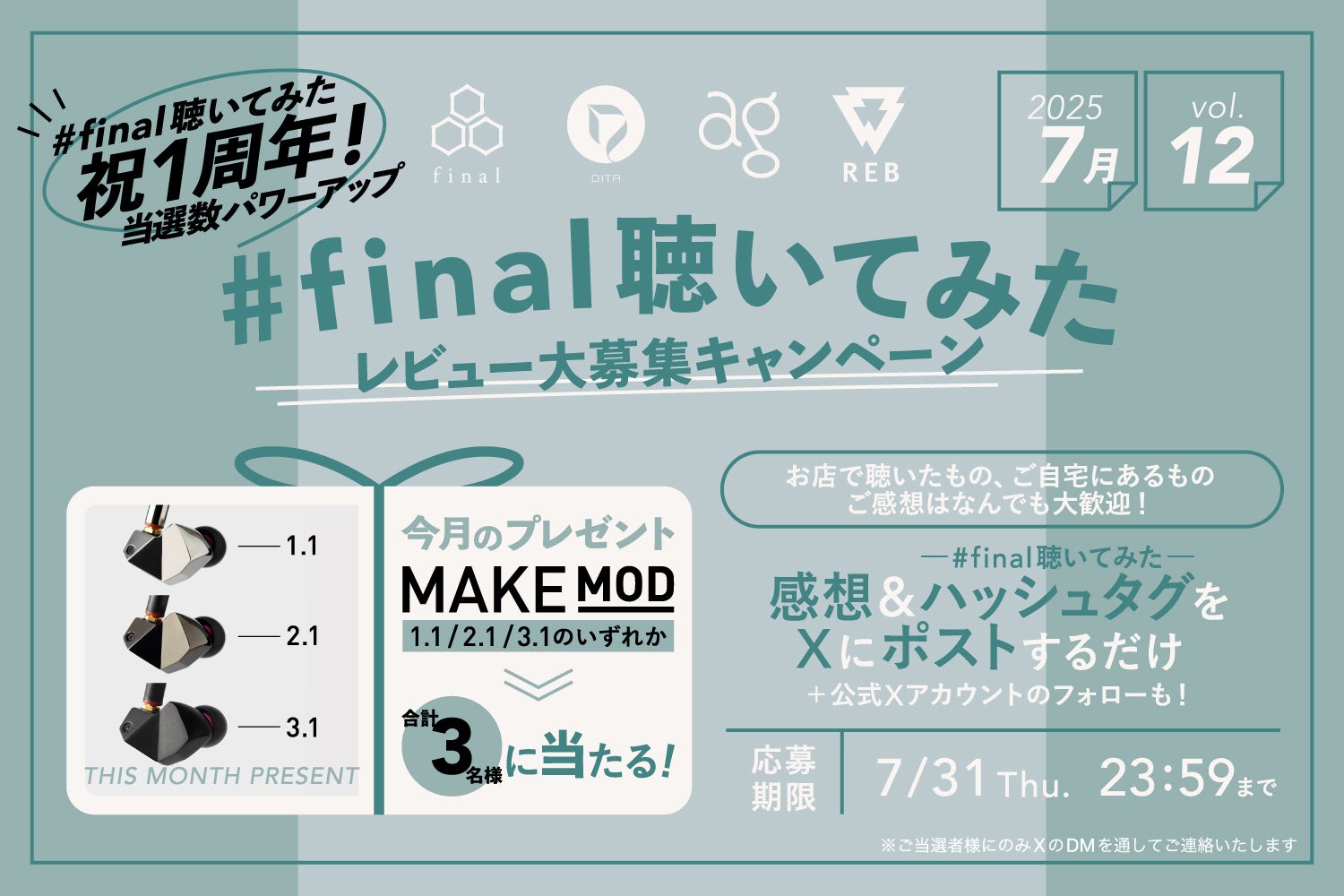final製品が毎月抽選で当たる「#final聴いてみた」キャンペーンの開催1周年を記念して、新イヤホン「MAKE MOD」を3名様にプレゼントいたします。