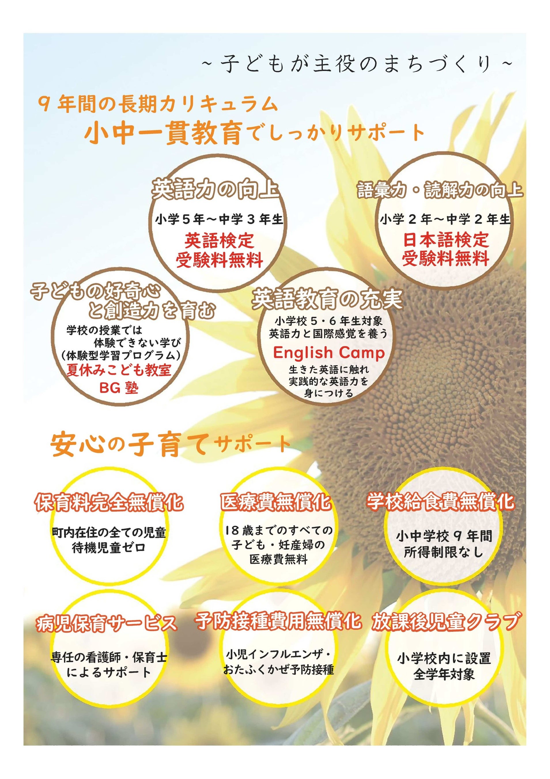 五霞町では、安心して子どもを産み育てることができ、子どもたちが健やかに成長していけるよう、妊娠中から18歳(高校3年生相当)に至るまで、各種の手厚い支援をおこなっています。